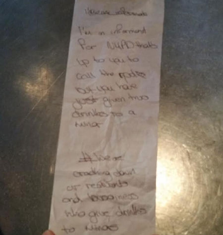 As I read the note, he looked at me and asked if I had read the note. Then I asked him for his ID/badge but he had nothing on him. So, I told him to settle the bill which he did not. Eventually I called 911 and he was arrested by the cops from 78th Precinct.