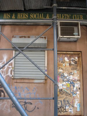 A couple treasures of Old Brooklyn have been hiding under scaffolding on Fifth Ave near Carroll Street since November 2007: Joe’s Shoe Repair and the His & Hers Social & Athletic Club.