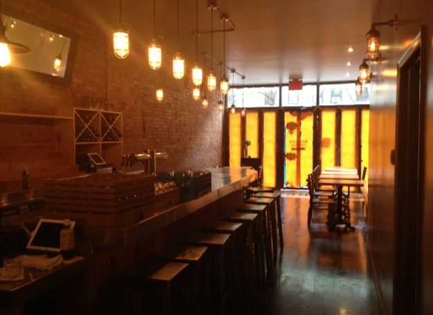 The space has been completely transformed, and is comfortable and casual. There's a seating area up front with a full bar behind that, and a hand-built wood-burning oven from Naples' Stefano Ferrara dominates the back room. There's a counter surrounding it so you can watch the magic happen, and behind that is an outdoor seating area, which should seat about 35. There's plenty of exposed brick and reclaimed wood; the counter is actually made from an old bowling alley.