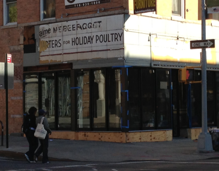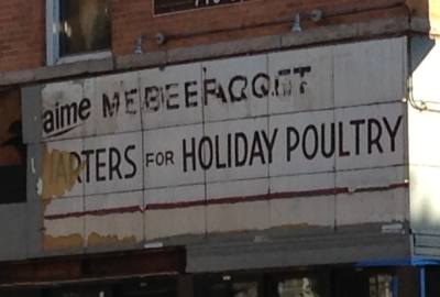 Underneath, at least on the Bergen Street side, is a sign for an old tenant, which in my guess was a poultry market. "--ARTERS FOR HOLIDAY POULTRY" (most likely"quarters", or chickens split into four pieces) is still clearly legible, as is "aime" up above, but the word after that is tougher to make out (unless "mebeeragqqt" is a word).