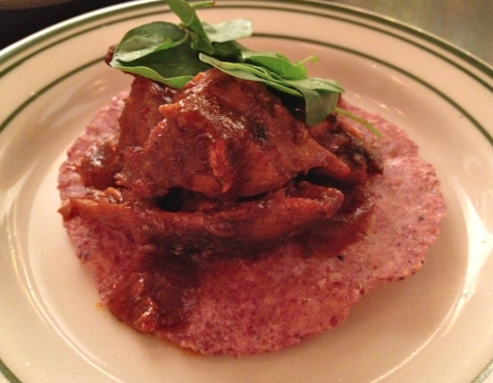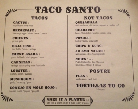The menu is pretty simple and straightforward (click on it for a larger image), with a handful of tacos topping out at $5, and a few additional items like quesadillas, huaraches, flan, and rice and beans. I tried the braised rabbit taco (below), a lobster taco, and mushroom, and can say that this is seriously gourmet. You'll most likely need a few of these to fill up (they're relatively small, averaging about 3 bites), but are worth the price: tortillas are made to order and only super-high quality ingredients are used. The $5 for a dozen tortillas also are a pretty good deal.